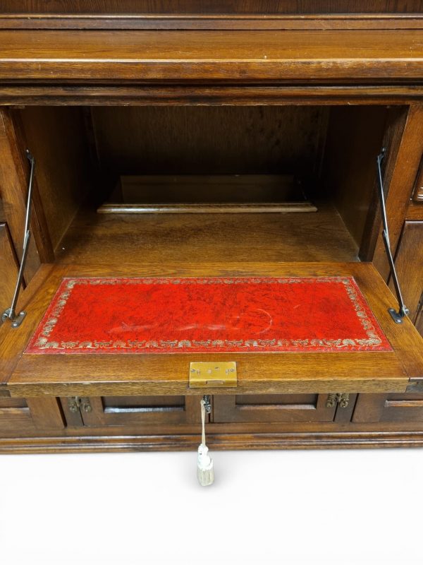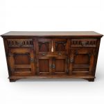 The base section offers generous storage, including carved panel doors, drawers with linenfold style fronts, and a central fall front drinks compartment .