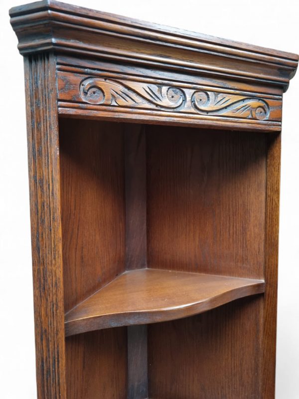 The cabinet features three open display shelves ideal for books, ornaments, or glassware, and a lower cupboard with a beautifully carved panel door for enclosed storage. Decorative scroll carvings to the cornice and door front add sophistication and timeless appeal.