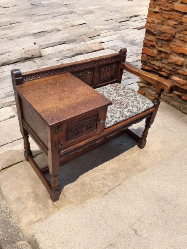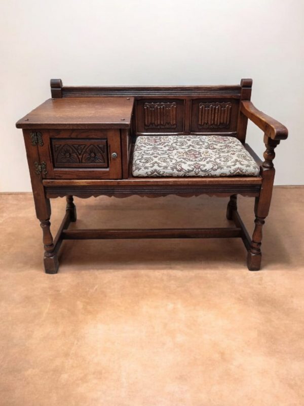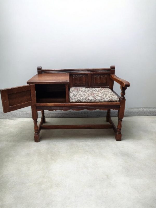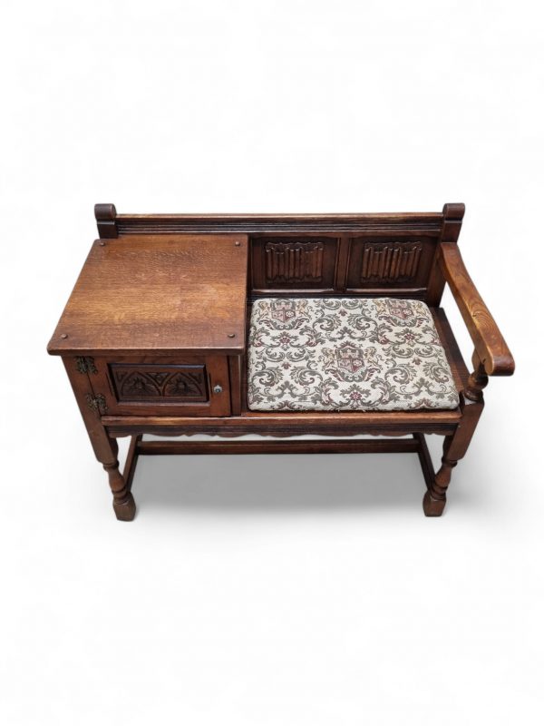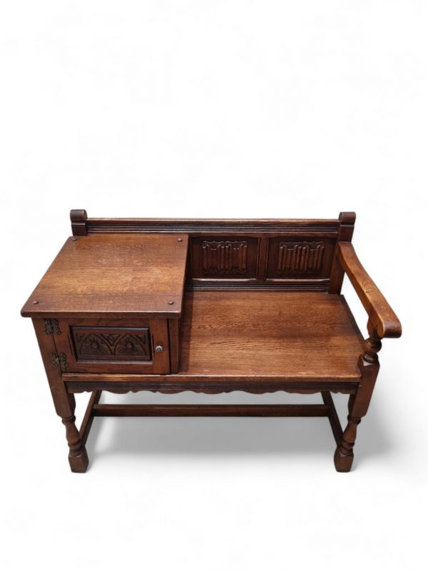The piece features a shaped back rail with carved panels, turned legs, and a storage compartment to the left with decorative linenfold and Gothic arch carvings unmistakably Old Charm.