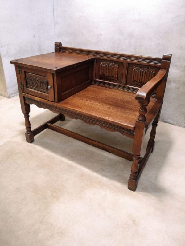 A classic Old Charm telephone table by Wood Brothers, finished in their signature Tudor Brown and showcasing the brand’s well-known craftsmanship and Gothic Revival detailing.
