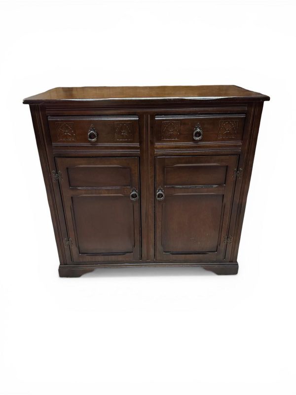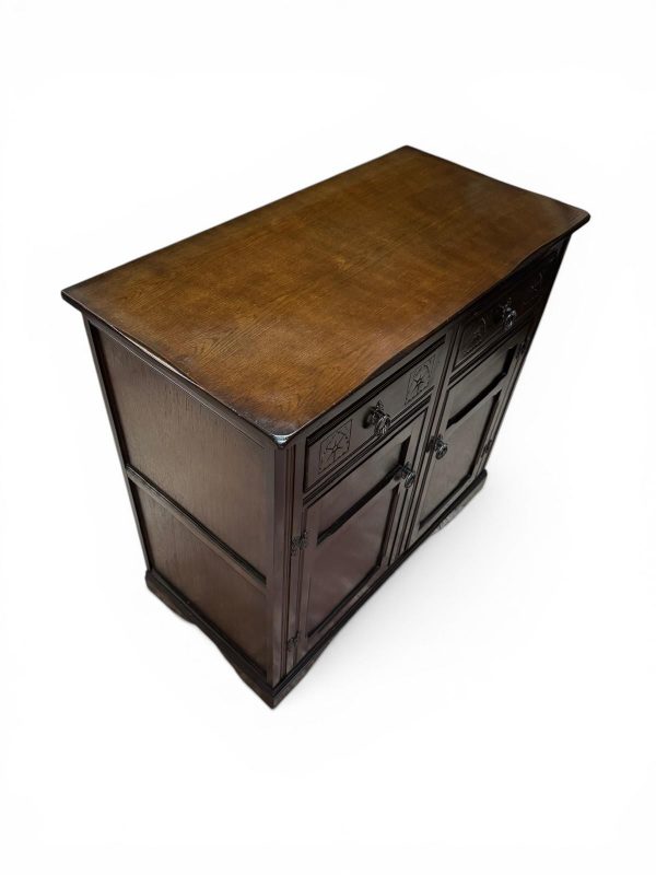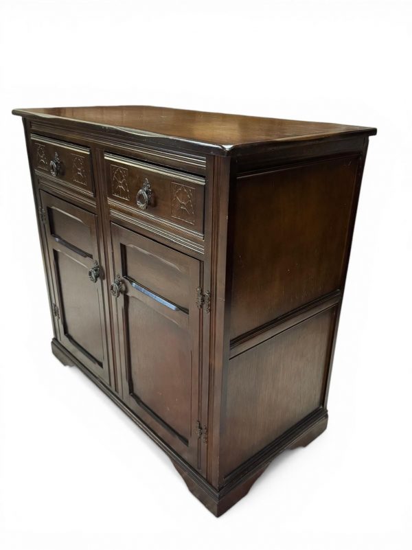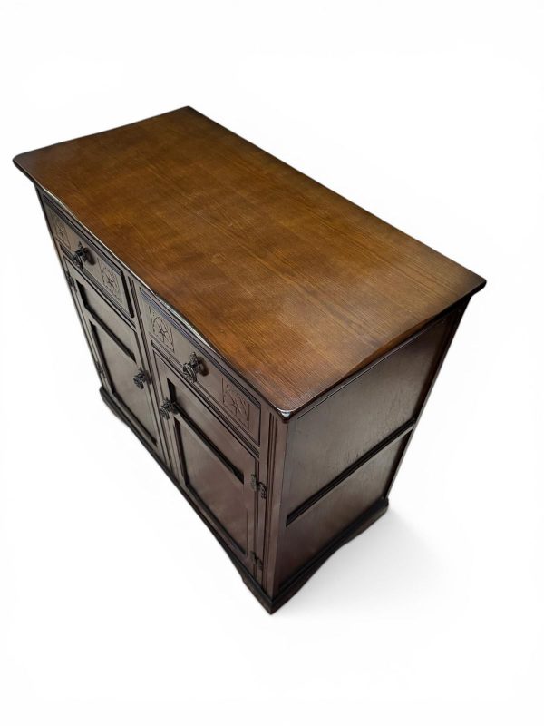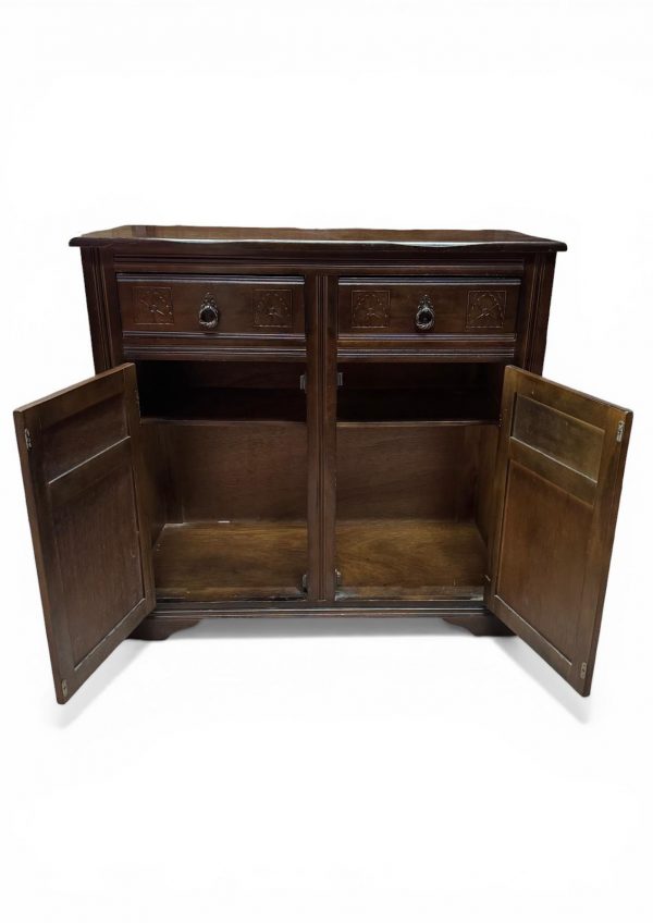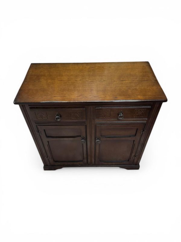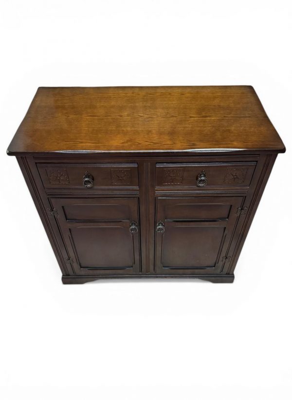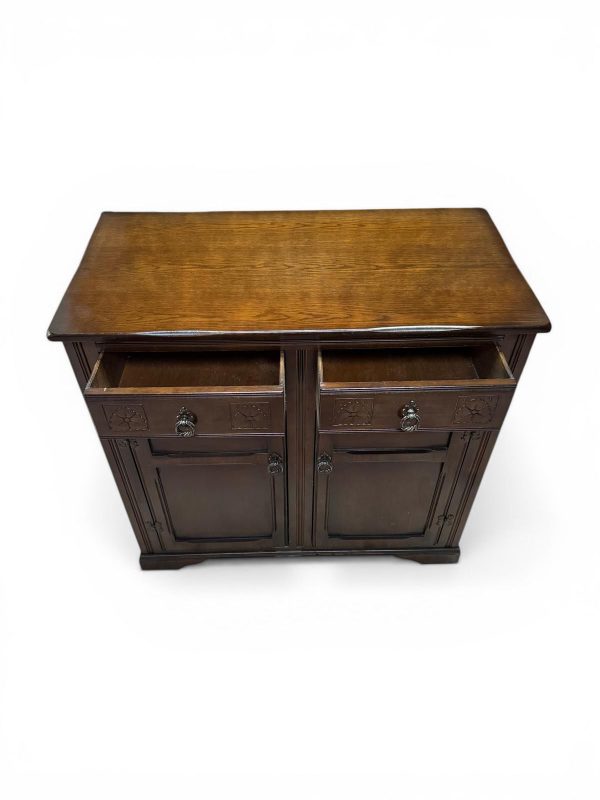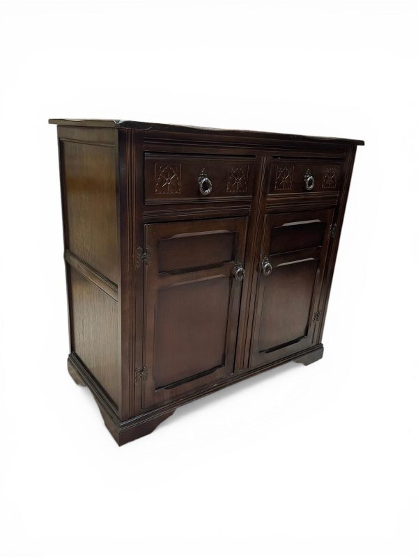 Crafted from solid oak with a deep, rich finish, this piece features subtle carved detailing and traditional metal handles, giving it a classic English character.