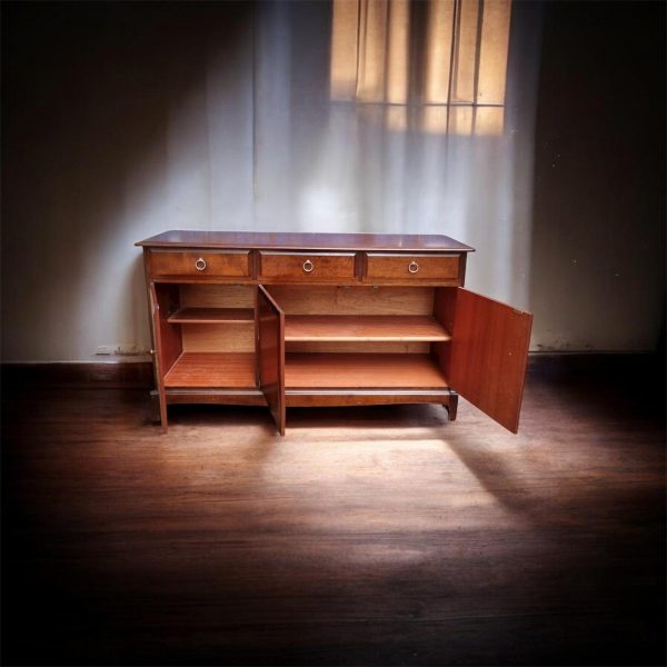 Finished in a warm mahogany tone, it features three frieze drawers with classic brass ring pulls over three cupboard doors, offering generous storage for tableware, linens or everyday essentials.