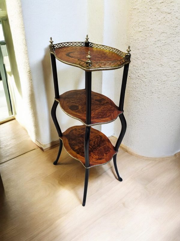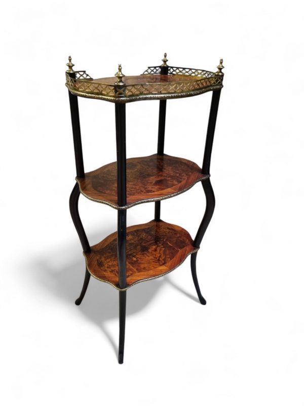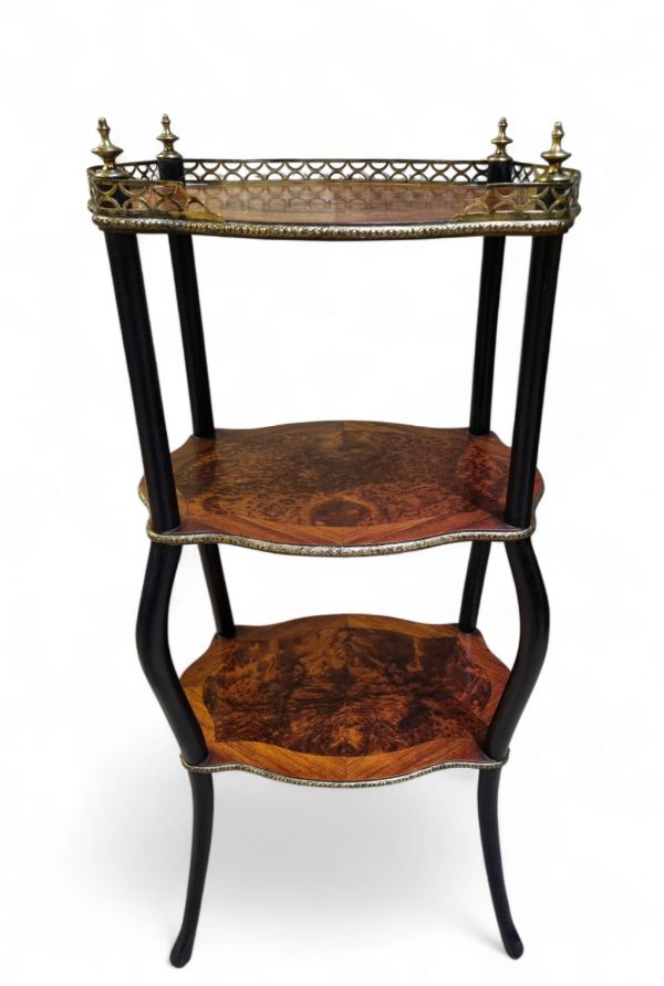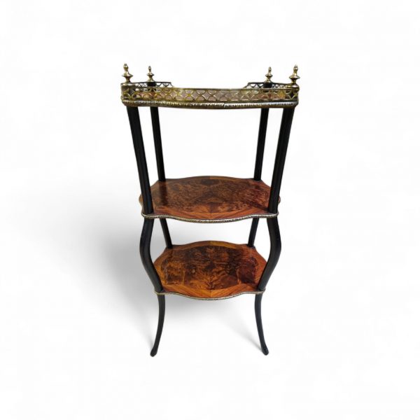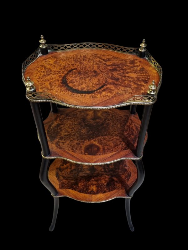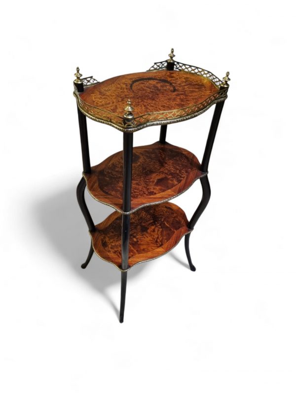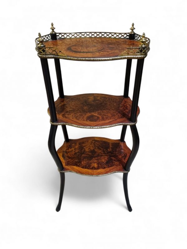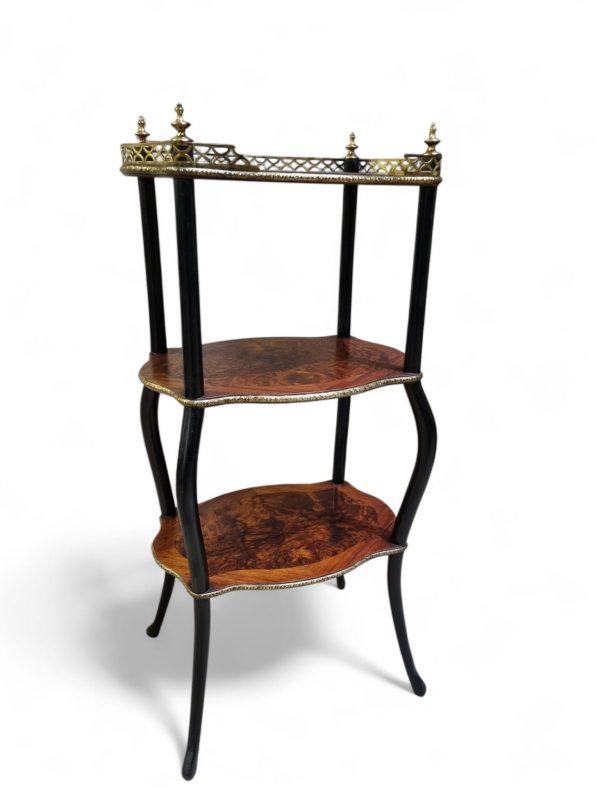 A beautiful vintage three tier occasional stand, elegantly crafted with striking burr wood veneer shelves, decorative brass gallery top, and slender black supports with graceful curved legs.