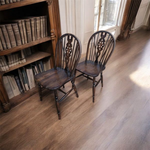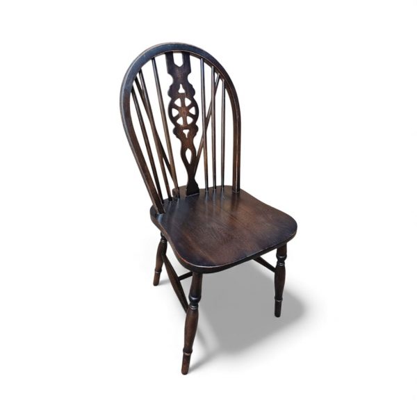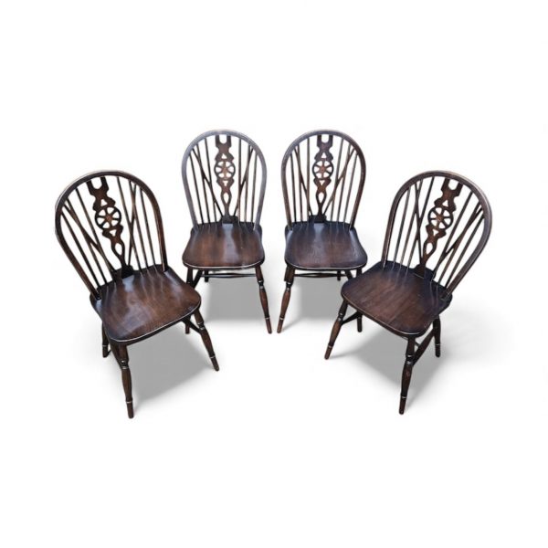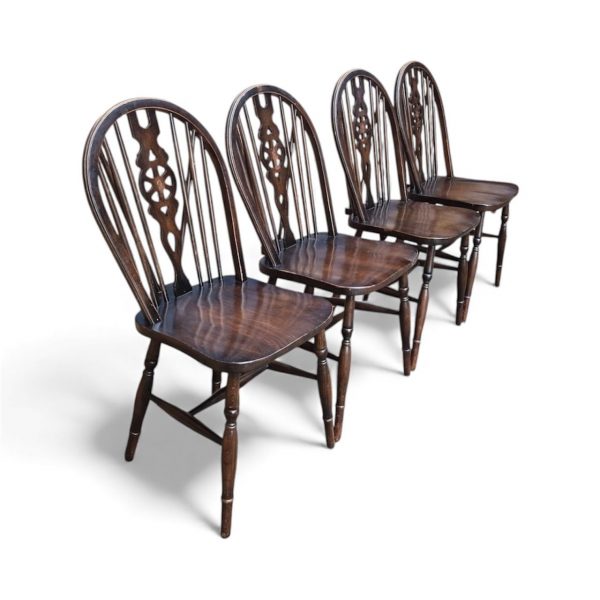 A lovely set of four English wheelback Windsor dining chairs, dating from the 1970s, finished in a rich dark oak stain.