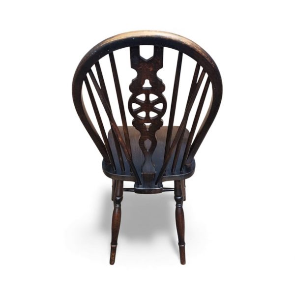 Each chair features the iconic arched spindle back with a pierced wheel motif, shaped saddle seat, and turned legs with H-stretchers for extra stability and charm.