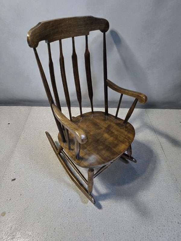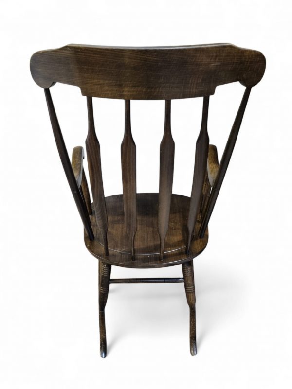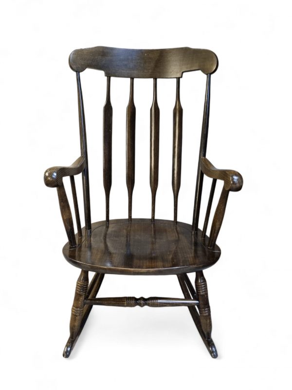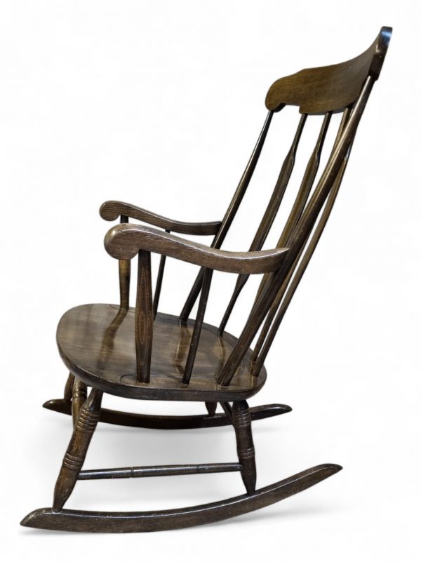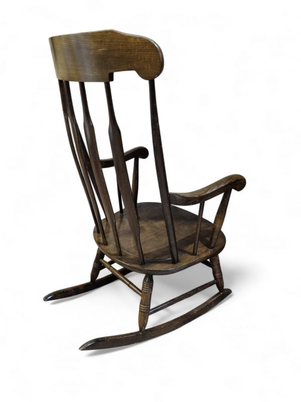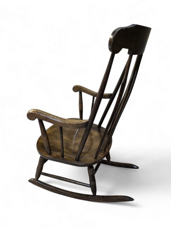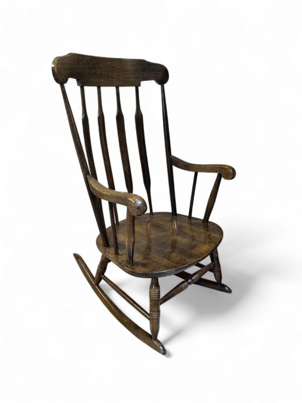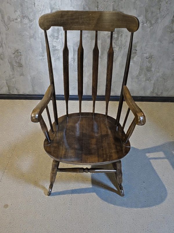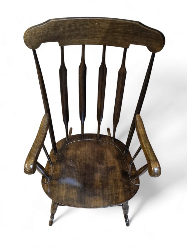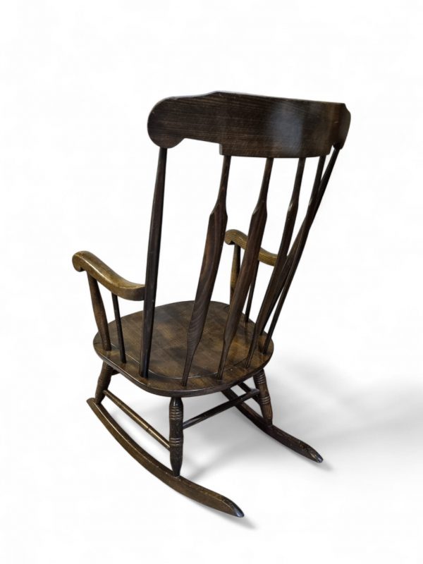 A classic vintage Windsor style rocking chair with arms, crafted from solid wood and finished in a warm dark stain that highlights the natural grain.
