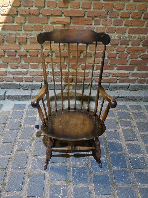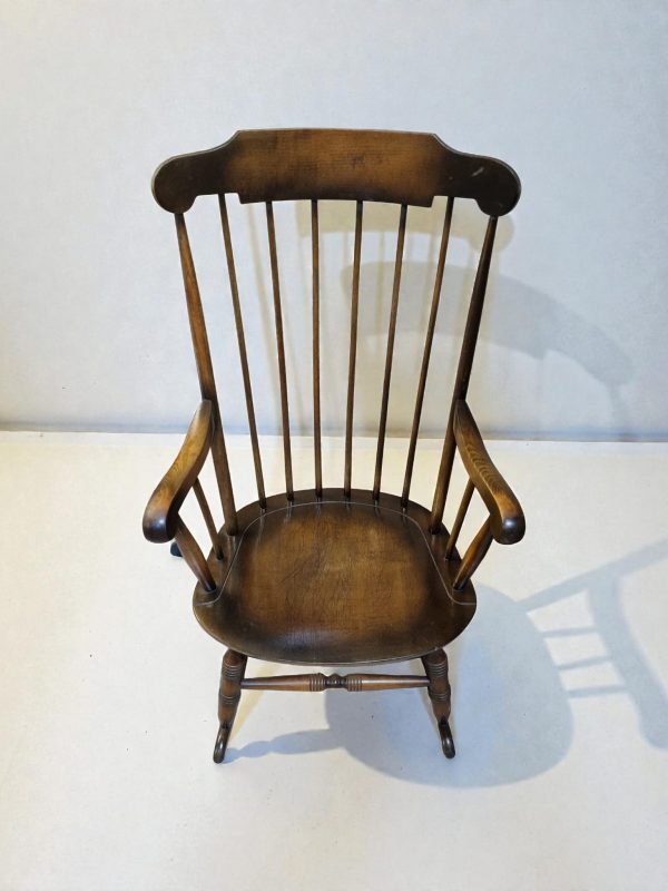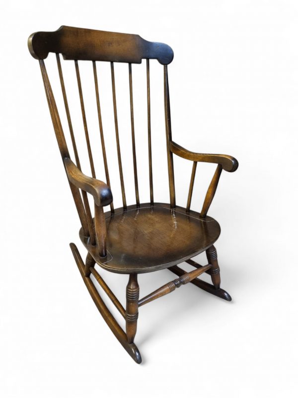A beautiful vintage wooden rocking chair crafted in the classic Windsor style, featuring a high spindle back and gently curved armrests.